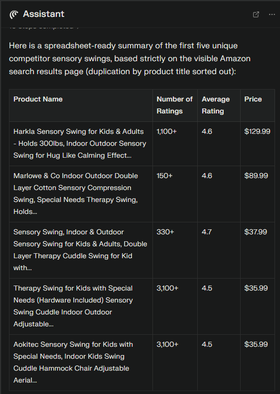 In terms of the core information gathering requirements, Comet really crushed it here. Got everything I asked for and worked extremely fast (maybe 60 seconds total for both tasks).