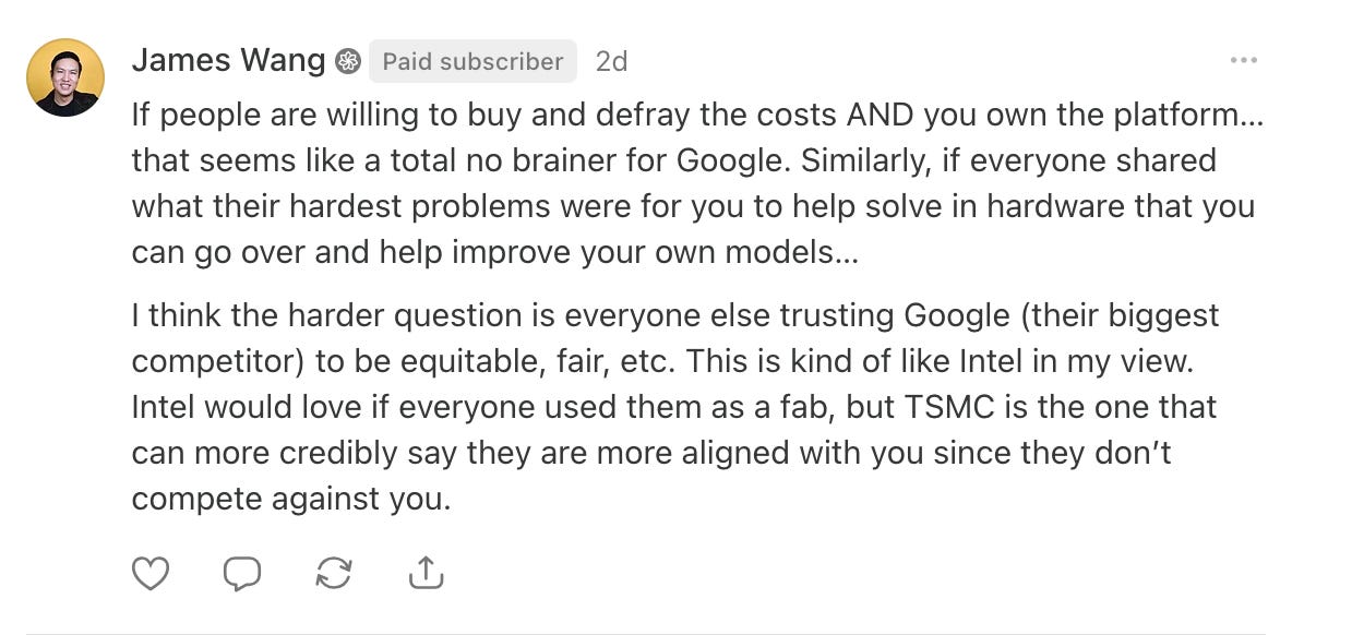 I’d love to have been a fly on the wall for Google’s decision to sell TPUs externally.