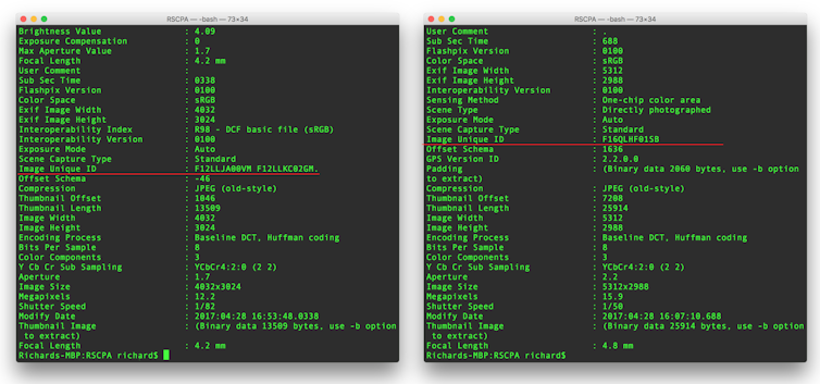 We inspected the images using Phil Harvey’s ExifTool and were able to determine that four of the images (left above) were taken by one camera, with the remainder taken by another.
