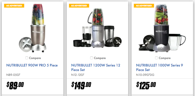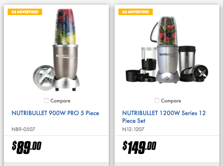 Imagine you are shopping for a Nutribullet blender. You see two options. The cheaper one, at $89, promotes 900 watts of power and a five-piece accessory kit. The more expensive one, at $149, is 1,200 watts and has 12 accessories.