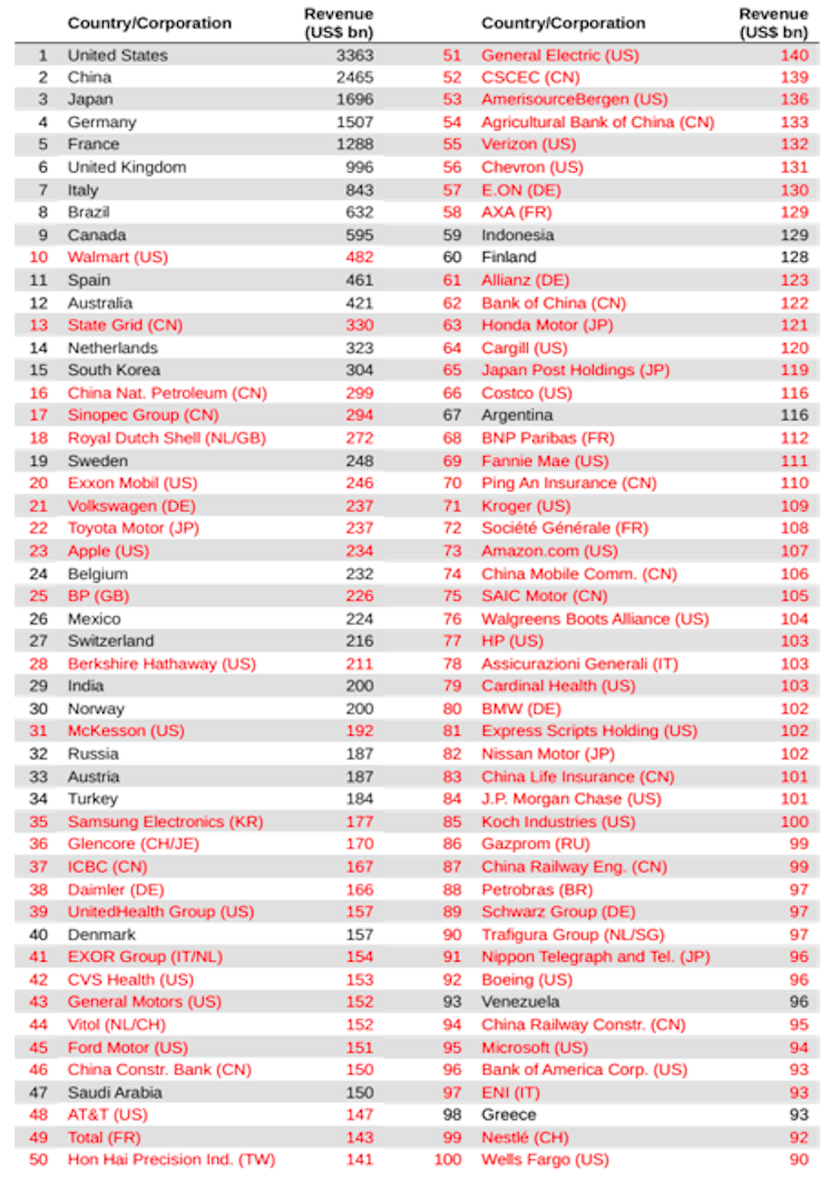 States occupy the top rankings, with the US first followed by China and Japan (the eurozone ranks first with more than US$5,600 billion if we treat it as a single political entity). But plenty of corporations are on par with some of the largest economies in the world: Walmart exceeds Spain and Australia, for example. Of the top 100 revenue generators, our ranking shows 71 are corporations.