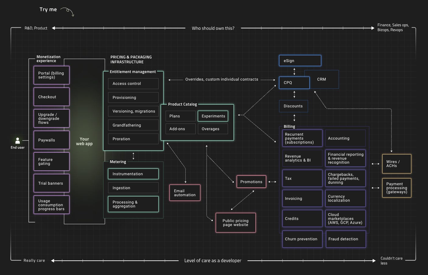 The moving parts of monetization infrastructure are enormous. Entitlements. Metering. Pricing catalogs. Subscription management. Usage governance. Billing. Revenue recognition. CRM sync. CPQ. Data warehouse integration. Each of these systems needs to stay in sync, in real time, across every customer and every plan.