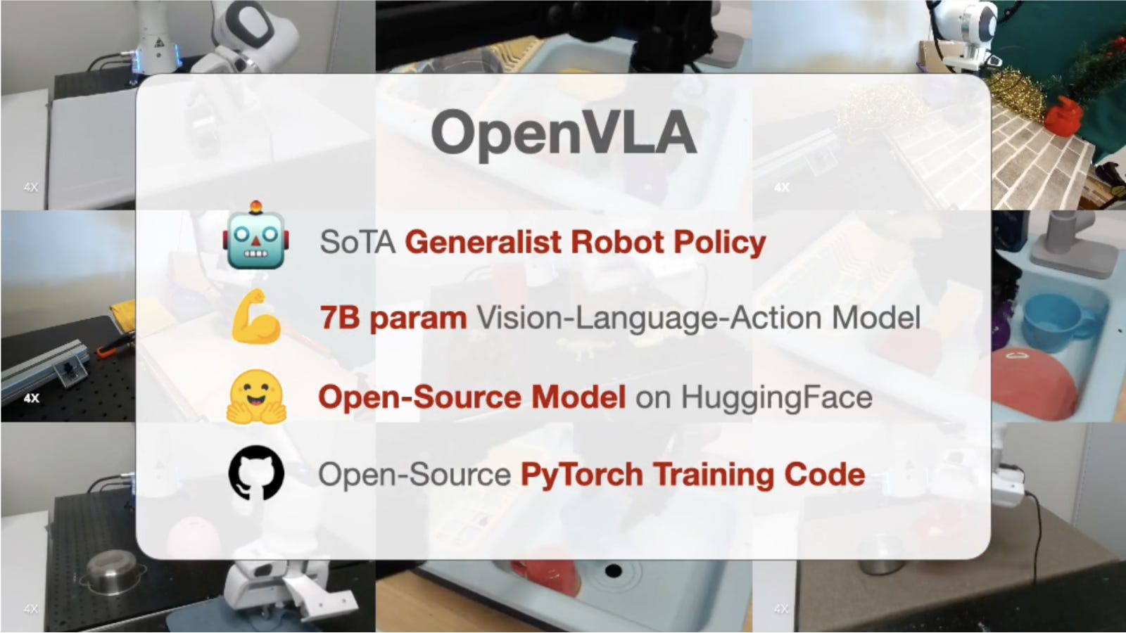 What’s up: A combination of top research labs released “OpenVLA: An Open-Source Vision-Language-Action Model” last week. Building on the success of other open source robotic models like ACT, OpenVLA is a generalist policy trained on a large variety of data collected across tasks, robots, and environments (all from the Open X-Embodiment dataset). The results show a step forward in performance, with the model generalizing better than state of the art alternatives such as RT-1-X, Octo, and RT-2-X.
