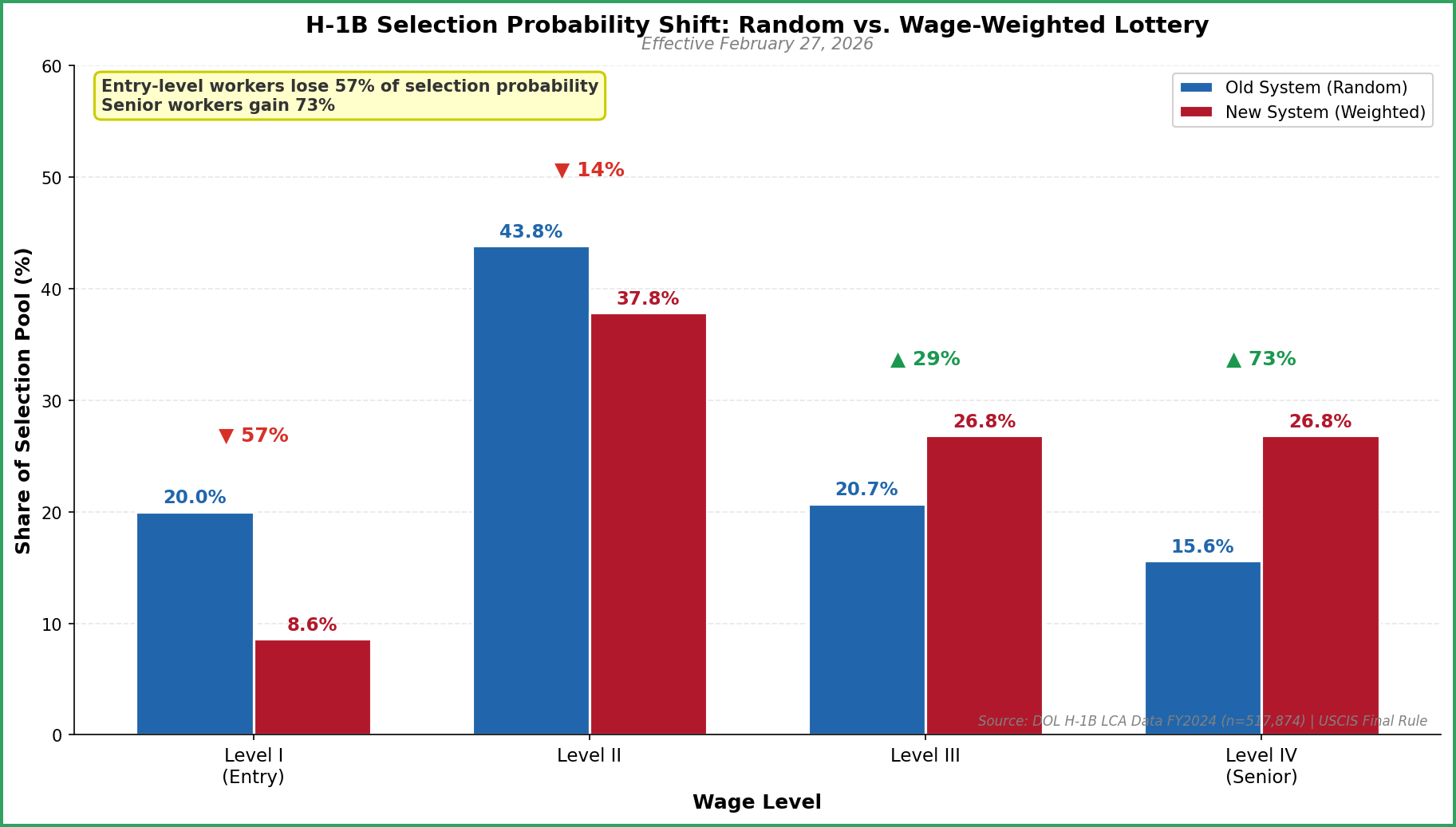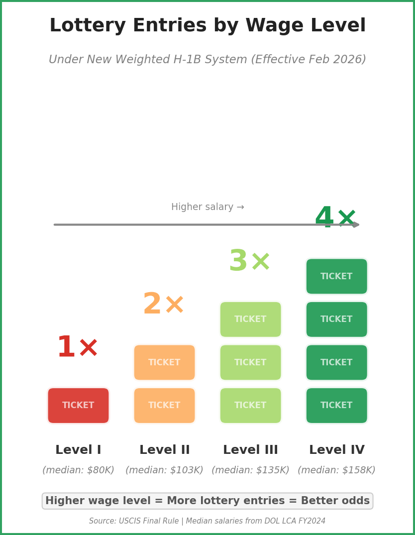 Starting February 27, 2026, a Level IV wage candidate receives 4 lottery entries while a Level I candidate receives only 1. Under the new weighted lottery system, the probability of securing an H-1B visa is no longer random—it is now mathematically determined by the salary offer attached to the application [1].