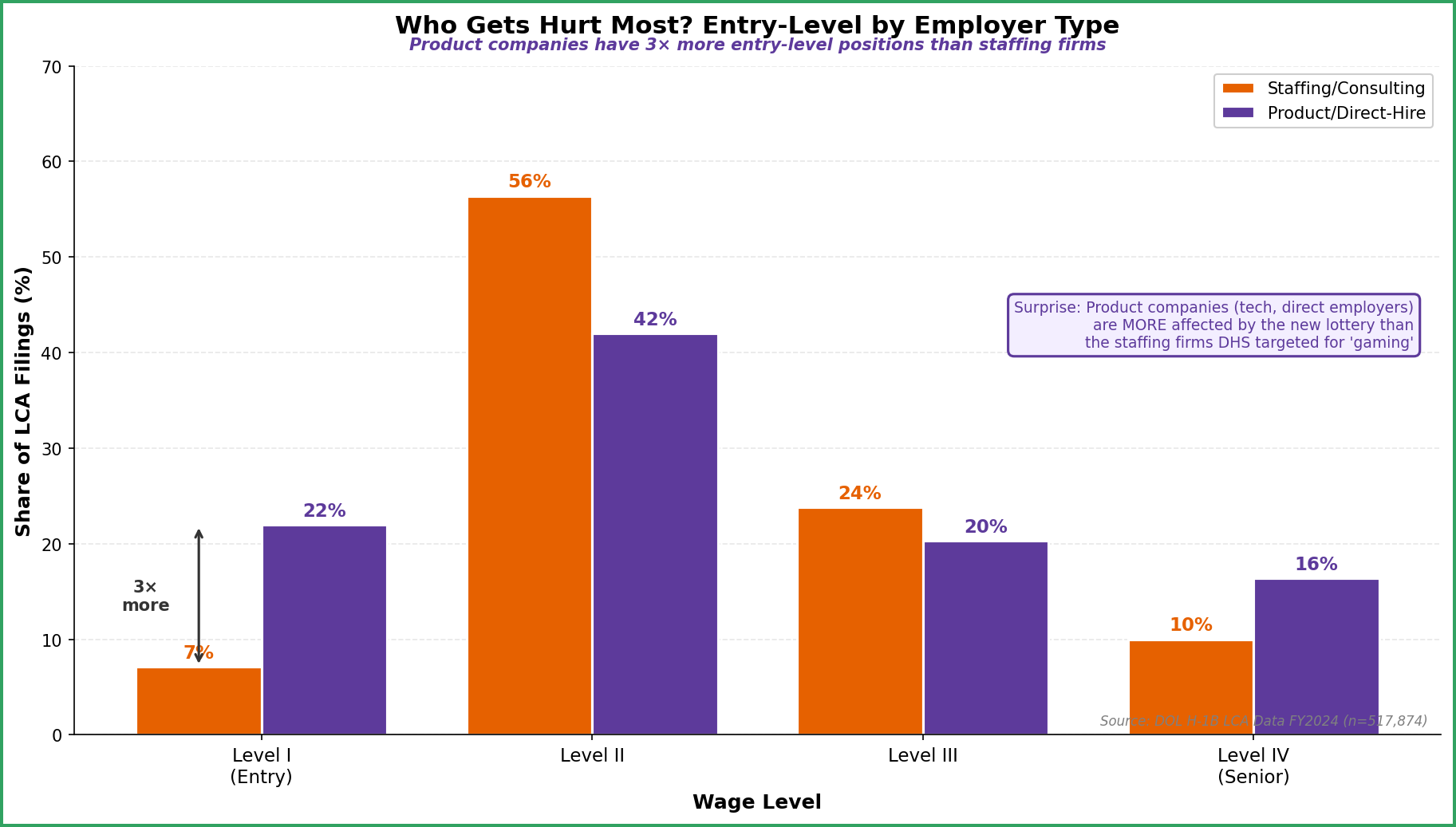 This means product companies hiring junior talent are more disadvantaged by the new system than the staffing firms DHS targeted for “gaming” the lottery. The narrative that this policy solely hurts “body shops” is contradicted by the data; it disproportionately impacts legitimate tech employers hiring early-career talent.