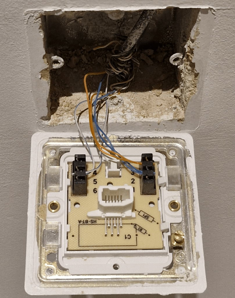 There is one single Cat5 cable. There are 4 wires connected. It’s definitely not a master socket. WTF?!