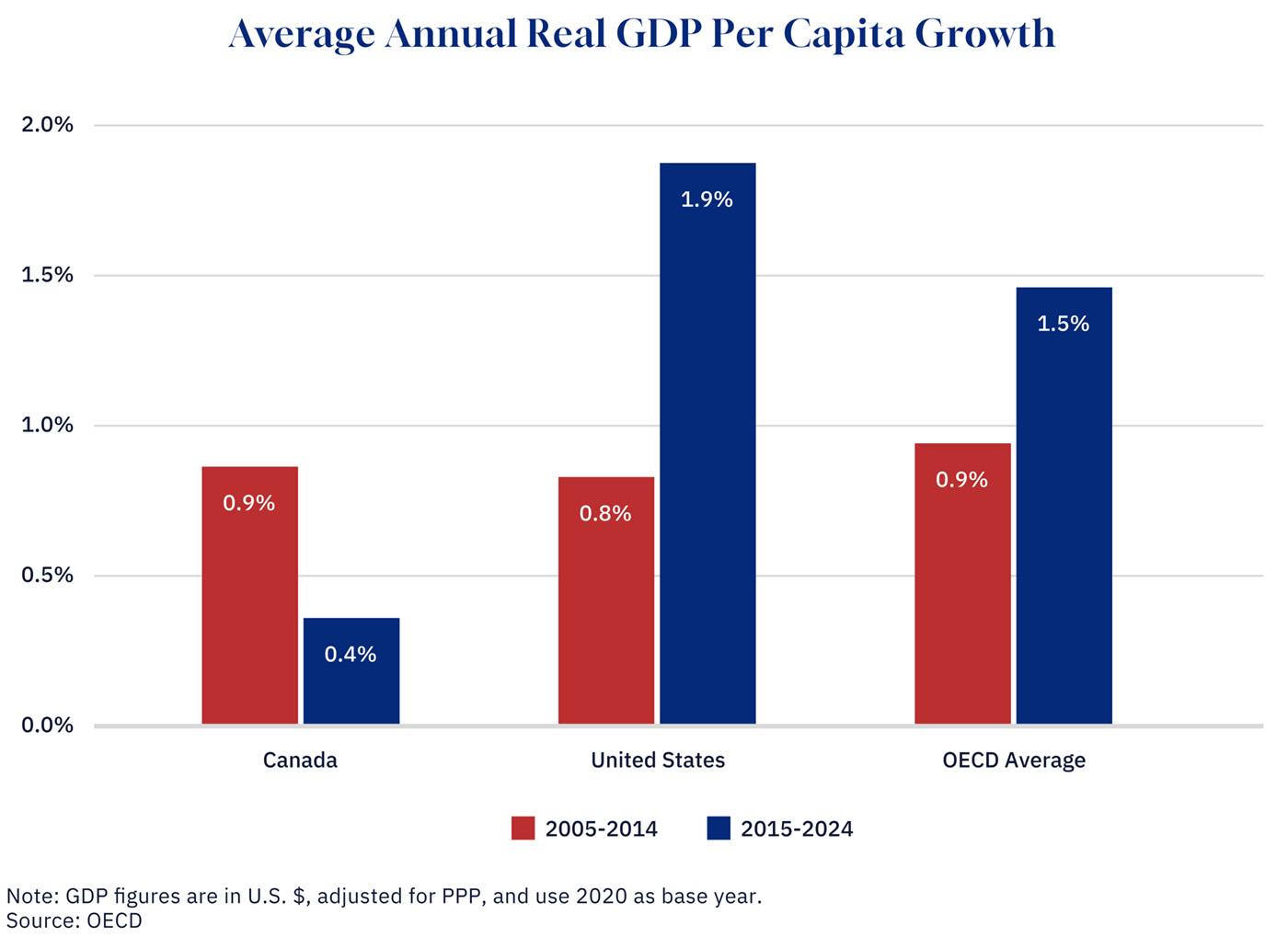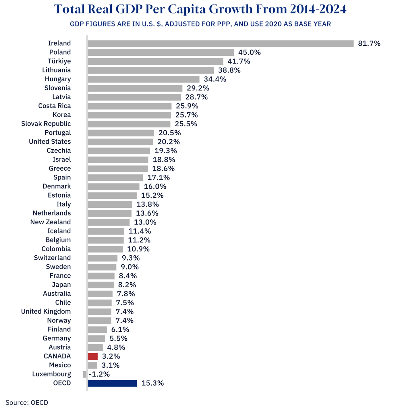 From 2014 to 2024, Canada’s real GDP per capita adjusted for purchasing power parity grew by just 3.2 percent in total, an anemic 0.4 percent per year on average, and the third lowest among 38 advanced nations. Over the same period, the United States posted 20.2 percent total growth (1.9 percent annually), and the OECD average reached 15.3 percent (1.4 percent annually). The measurement shortcomings cannot explain five-to six-fold differences in growth rates.