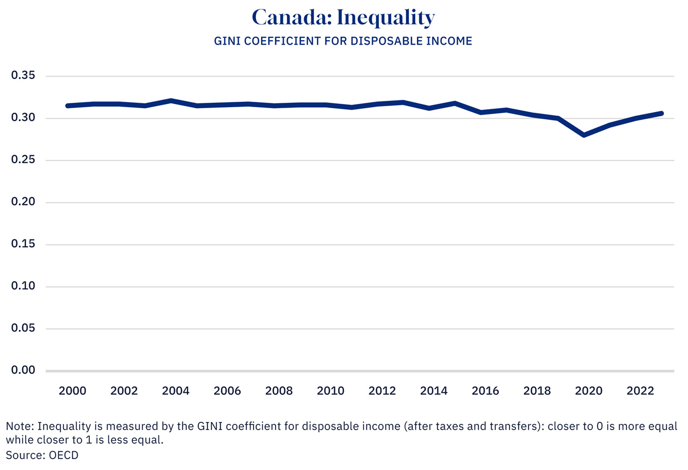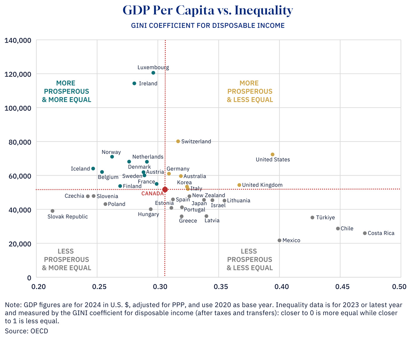 Canada is not choosing equality over growth. We have fallen to 99.5 percent of the OECD average GDP per capita in 2024, down from above average historically, while maintaining only middling equality. Apart from modest pandemic-era improvements, our income distribution has remained essentially unchanged. We are falling behind in prosperity without material gains in equality.