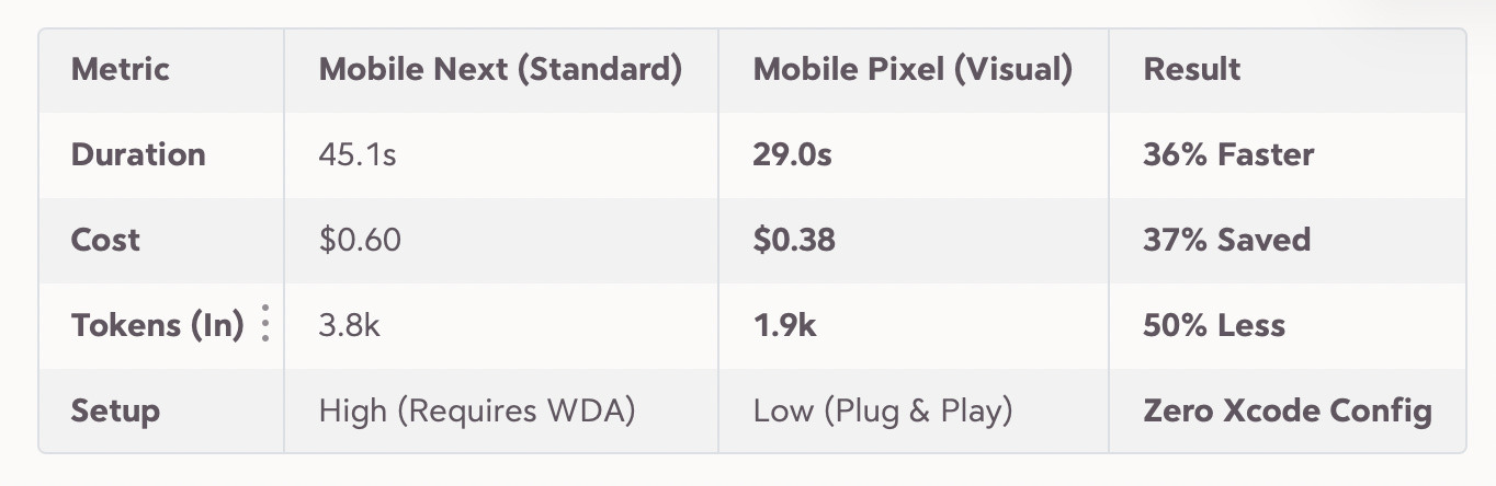I wanted to check if visual automation wasn’t just “cool,” but actually efficient. So I ran a head-to-head battle between the standard accessibility tree approach (Mobile Next) and Mobile Pixel.