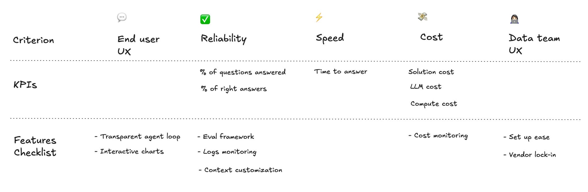 End user UX: How easy it is for any user - technical or not - to run analytics. The UI must be intuitive, explain the agent reasoning, and give some interactive features for deep-diving.