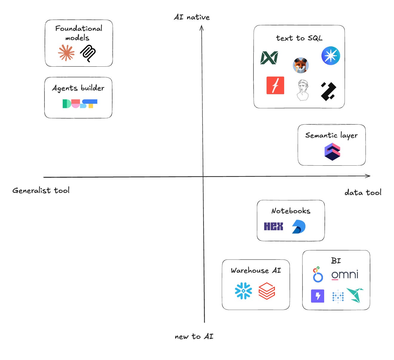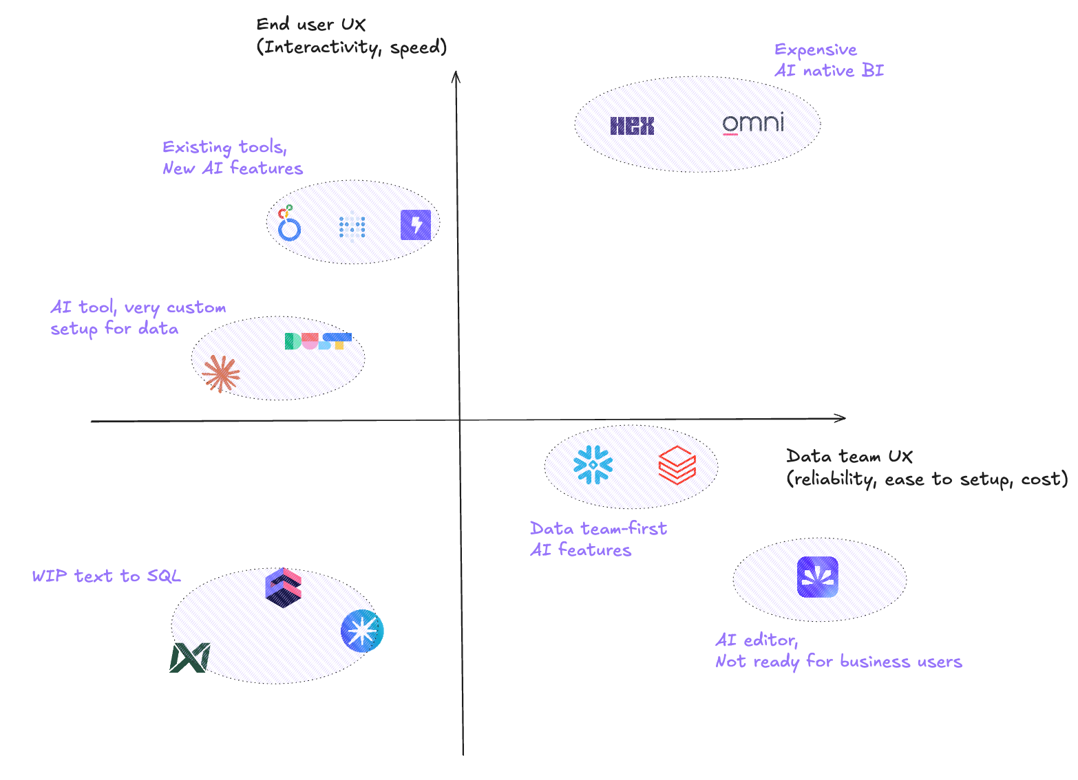 Text to SQL tools seem still WIP - end user UX is new, data teams often need to rebuild context in them, and have no guarantee of reliability.