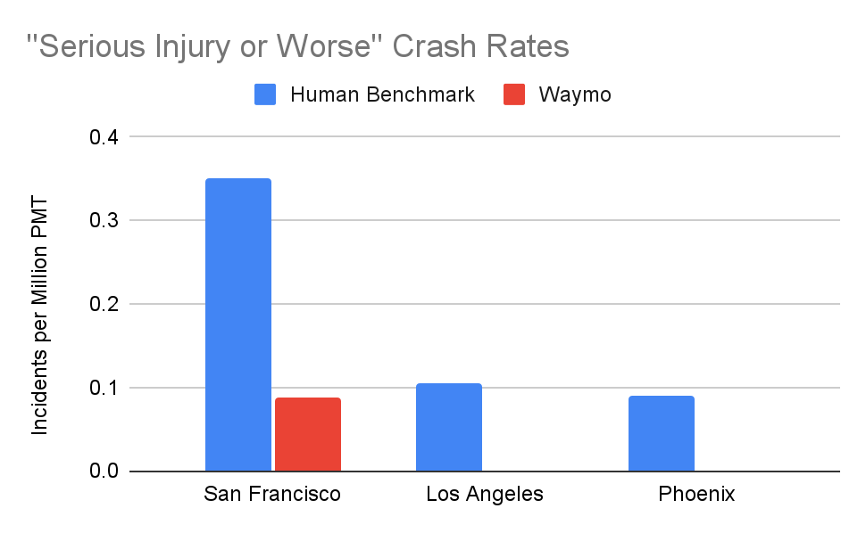 After adjusting for passenger miles traveled, Waymo has ~65% lower incident rate than human drivers.