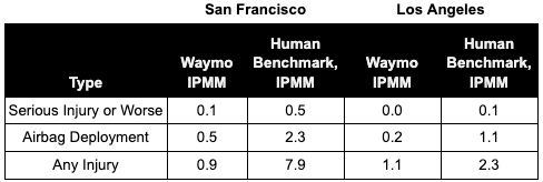 After adjusting for passenger miles traveled, Waymo has ~65% lower IPMPM than human drivers (“Airbag Deployment” incidents, assuming Waymo reporting and benchmarking are accurate).