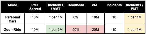 Consider a simple example to demonstrate (1). A fictional rideshare company, ZoomRide, completes the same number PMT (10 million) as personally-owned cars in some geographic area. ZoomRide claims that their drivers crash half as frequently as other drivers. But does that make the roads safer?