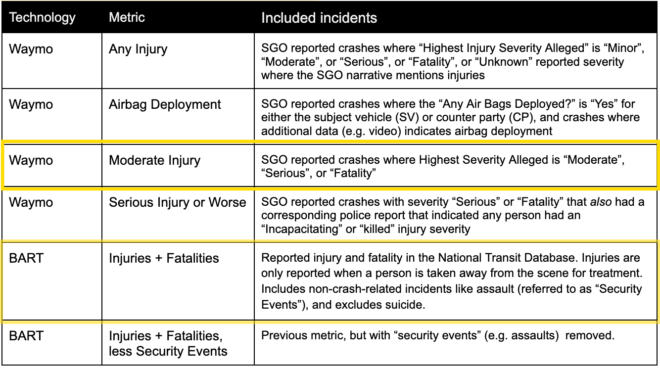 Incident type comparison: Define which safety incidents to compare between Waymo and BART
