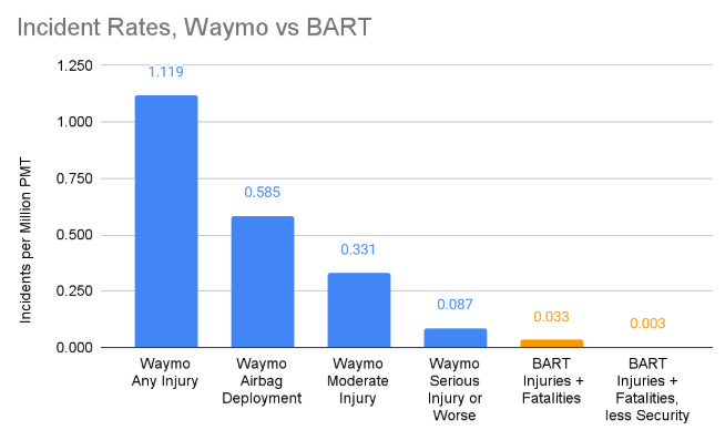 Based on my reading of reporting requirements, the best comparison is Waymo’s “Moderate Injury” rate to BART “Injuries + Fatalities”. BART reports incidents if someone is transported for treatment, and therefore undercounts relative to Waymo’s “Any Injury” and “Airbag Deployed”. However, BART reports more incidents than would be included in the Waymo “Serious Injury or Worse” bucket.