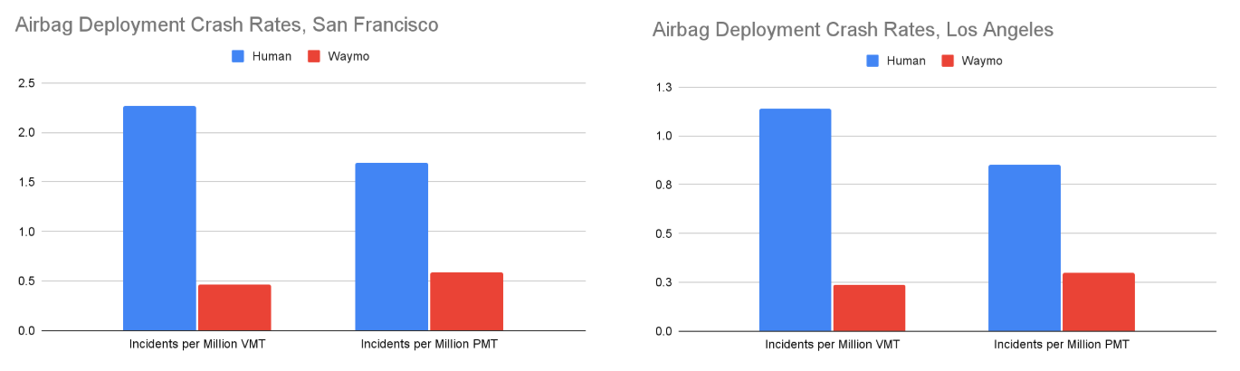 Figures 2 and 3 show the impact of adjusting Waymo’s “Airbag Deployment” incident rate to Incidents per Million PMT (IPMPM). In San Francisco, Waymo has 79% lower IPMM, but 65% lower IPMPM.