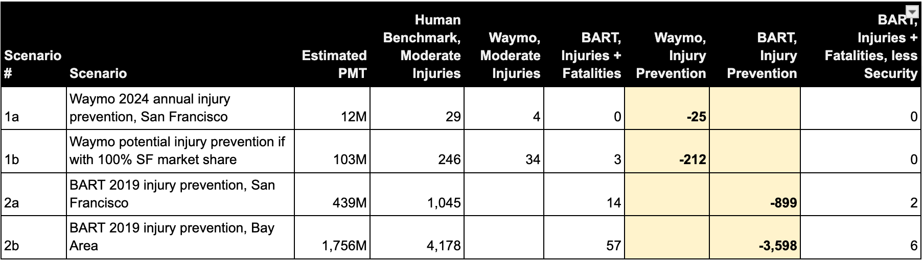 In 2019, BART prevented ~900 moderate injuries in San Francisco, while Waymo prevented ~25 in 2024. Even if Waymo had 100% rideshare market share, it would only have ¼ the safety impact of BART.