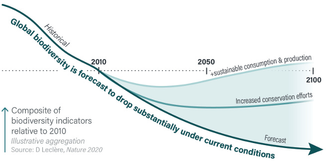 At the heart of the assessment, the report identifies 6 critical ecosystems with a “realistic probability of collapse” starting for some as soon as 2030. The Boreal Forests in Russia and Canada, the Himalayas, the coral reefs in South-East Asia, the Amazon and the Congo Basin are all expected to soon reach a “tipping point”, beyond which major loss of biodiversity are deemed irreversible. A salient example given in the report is the Amazon shifting irremediably toward a drier savannah-type state starting 2050. These unpredictable shifts may take decades, if not centuries before reaching another stable state.