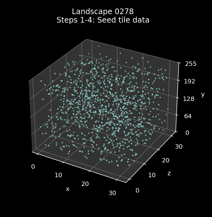 Here's a visualisation of the landscape generation process for landscape 0000 (you can click on the image to see a bigger version, as with all the images in this article):
