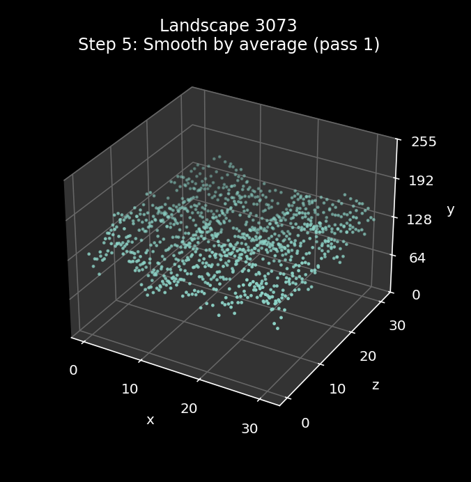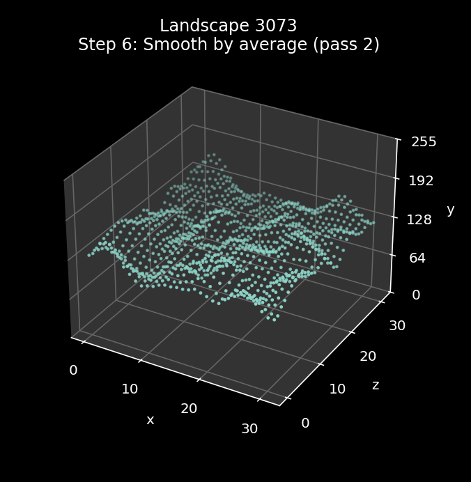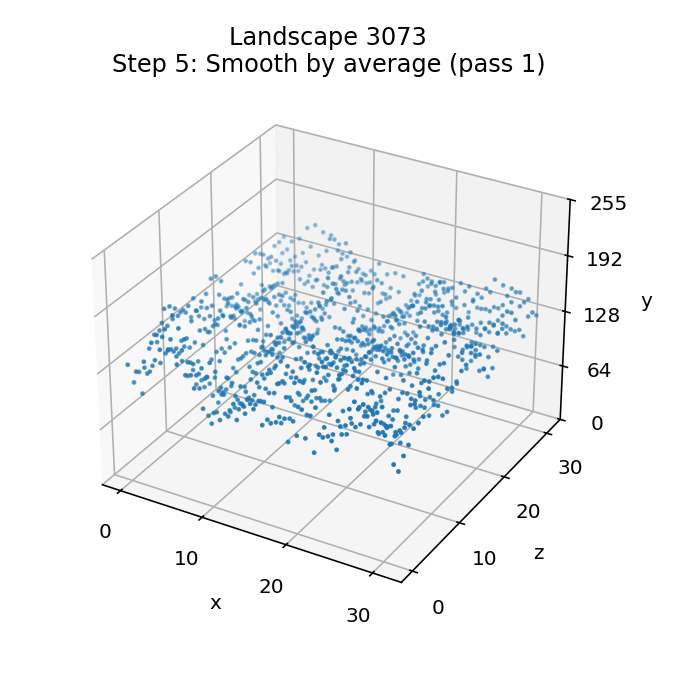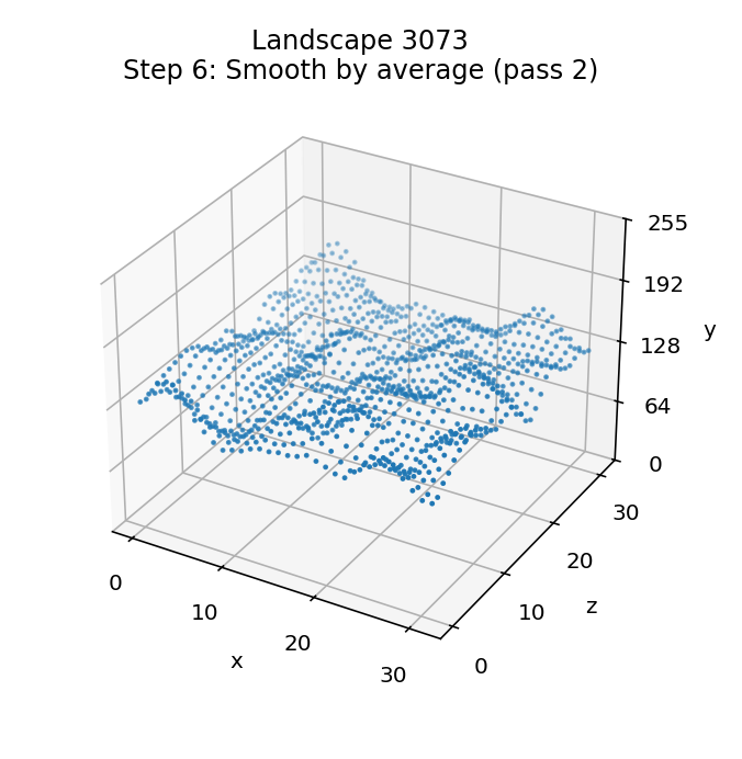 The effect of this repeated smoothing process is quite hard to see, as by this point the landscape is in pretty good shape. The best way to see the differences is via the animations at the start of this article, where you can just about make out a handful of changes between the steps in landscapes 0000 and 3073 (it's pretty subtle, though). The gentle landscape in 0278 doesn't change at all in this step, as the first pass is enough to remove all spikes and troughs.
