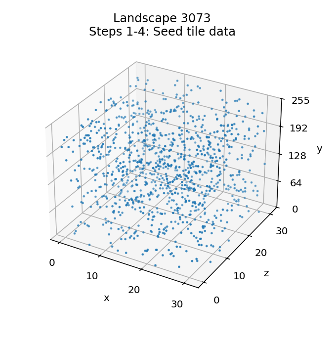The x-axis is along the front left and the z-axis is along the front right, so the landscape grid is effectively the bottom level of this graph with the front of the landscape along the front left edge. Each tile has an associated seed byte in the range 0 to 255, which is shown by the height up the vertical y-axis.