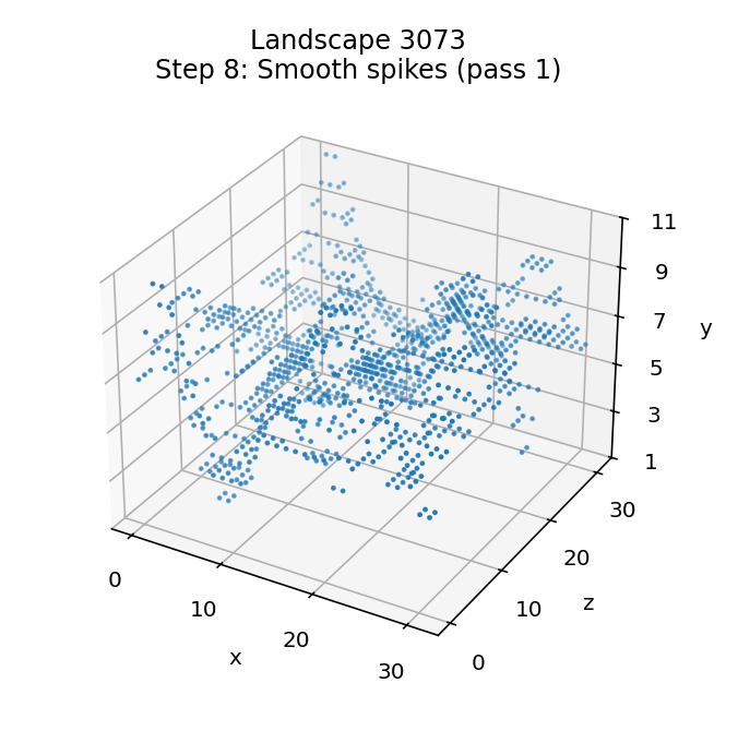 | 8 | Smooth any spikes and troughs (pass 1) | Smooth the landscape by smoothing over any single-point spikes or troughs | SmoothTileData A = bit 6 set |