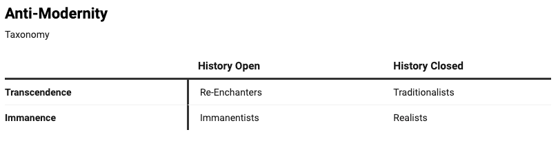 This essay, therefore, is a taxonomy of anti-modern thought along two axes: