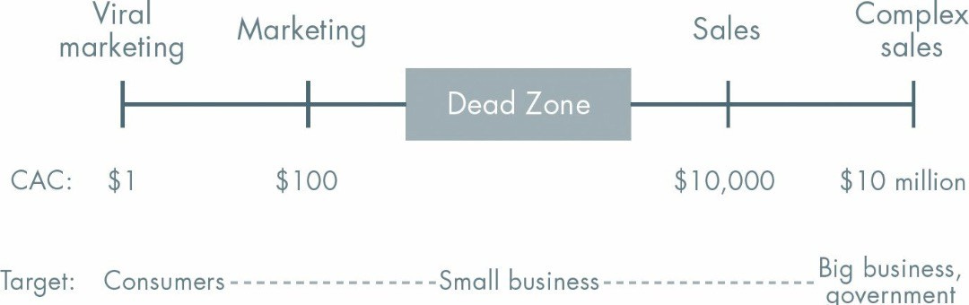It might seem premature to think about unit economics at this point but ignoring it can be fatal. As Peter Thiel called out in Zero to One, you want your customer acquisition cost (CAC) to be significantly lower than your customer life-time value (LTV). Otherwise, you risk falling into the ‘Dead Zone’ where you can’t acquire new customers profitably. He explains a simplified version as follows: