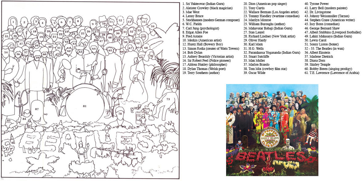 Peter Blake’s ensemble cover of Sgt Pepper’s Lonely Hearts Club Band – for that’s what the developing concept would eventually become – is a perfect illustration of the variety of intellectual and artistic ingredients that each Beatle was consuming. Blake invited the band members each to pick a number of famous figures they would like to include on the cover. McCartney chose Stockhausen, Aldous Huxley and Fred Astaire, among others. Harrison named a load of obscure Indian holy men. Lennon, ever the bore, chose Hitler and Christ, before being persuaded not to,3 but still got Edgar Allen Poe, the Marquis de Sade, and Oscar Wilde. Ringo famously said he’d be happy to go along with whomever the others chose.
