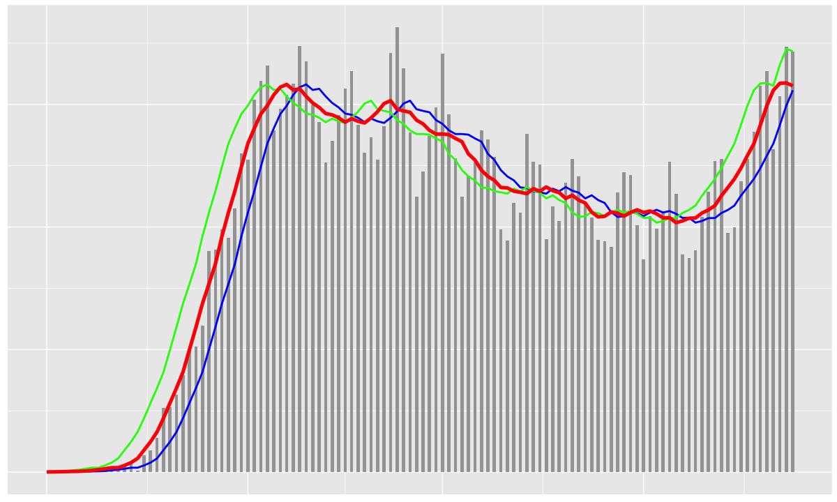 But that’s a worthy trade-off for the fact that a centered average tracks much more closely with the raw data, showing a more accurate picture overall. That much is made clear from this comparison of the same data as above with an average of the previous week (blue), an average of the following week (green), and the centered average that TIME uses (red):