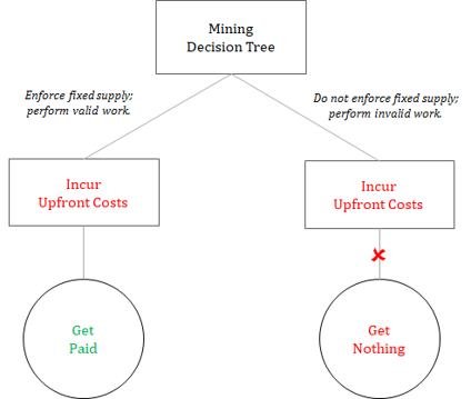 And recall that a pre-defined number of bitcoin are issued in each valid block (that is, until the 21 million limit is reached). The bitcoin issued in each block combined with network transaction fees represent the compensation to miners for performing the proof-of-work function. The miners are paid in bitcoin to secure the network. As part of the block construction and proposal process, miners include the pre-defined number of bitcoin to be issued as compensation for expending tangible, real world resources to secure the network. If a miner were to include an amount of bitcoin inconsistent with the pre-defined supply schedule as compensation, the rest of the network would reject the block as invalid. As part of the security function, miners must validate and enforce the fixed supply of the currency in order to be compensated. Miners have material skin-in-the-game in the form of upfront capital costs (and energy expenditure), and invalid work is not rewarded.