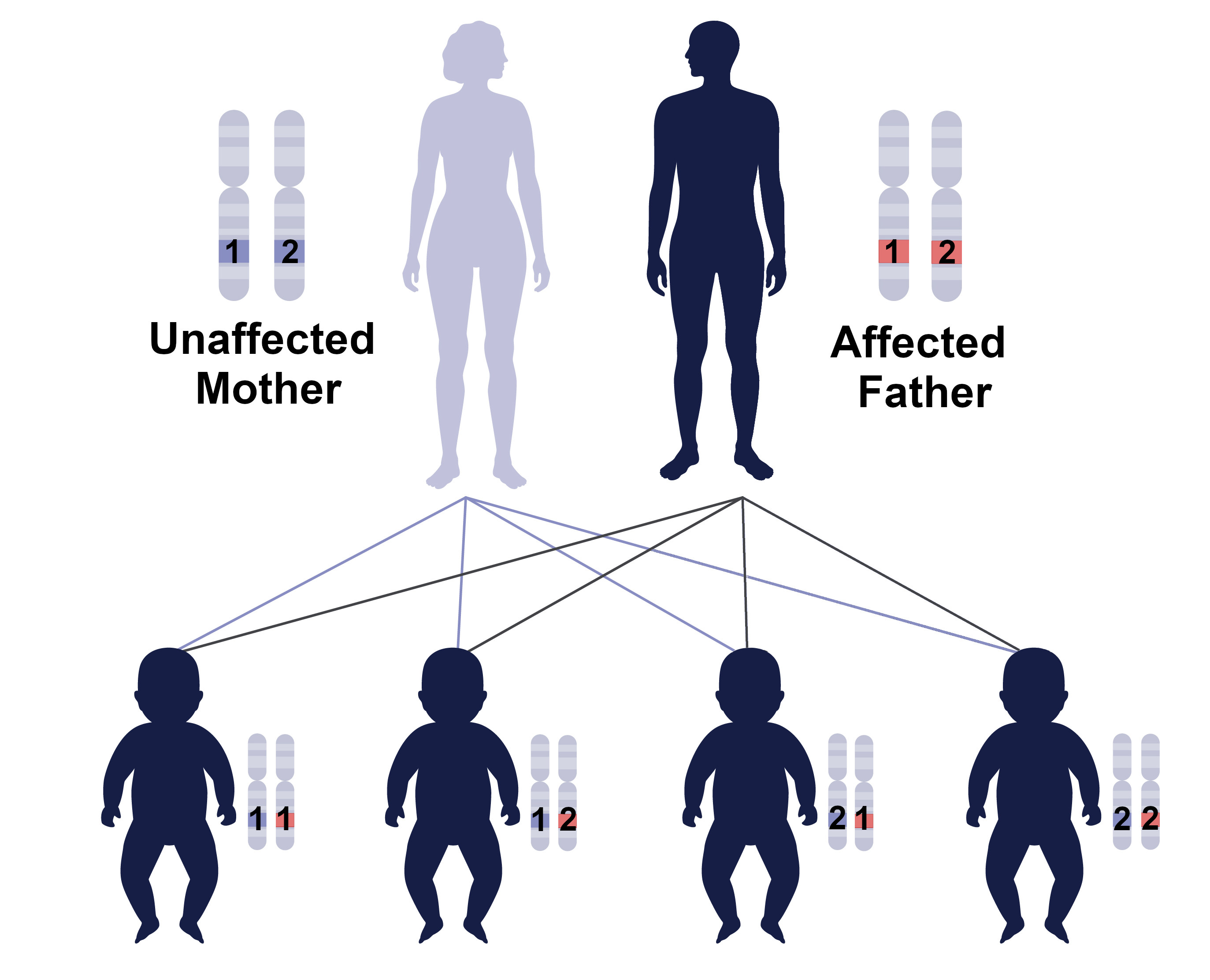In this example of inheritance of a disease-causing gene, the father has two copies of the faulty gene, and the disease is present when just one faulty copy is passed down. In these rare cases, no matter the combination of genes from the parents, the children will have an affected gene. Scientists and bioethicists have pointed to scenarios like this as the most compelling cases for human embryo editing. Visual: iStock via Getty Images; modifications by Undark