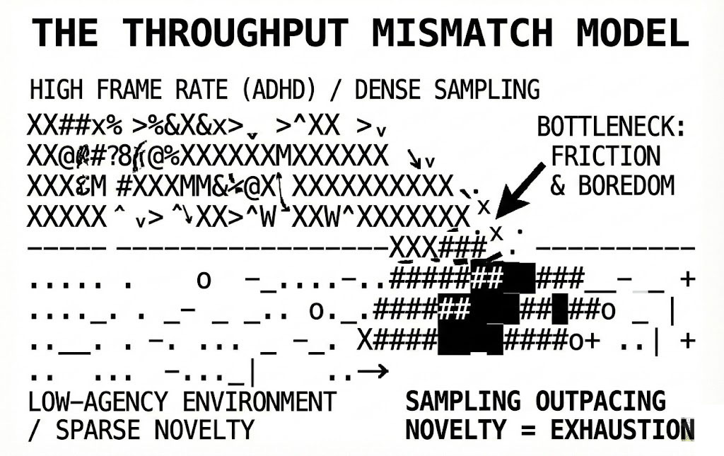 This would map that high-agency environments — contexts where acting on perceived affordances is actually appropriate — should be paradoxically less exhausting for ADHD individuals than low-agency environments with equivalent stimulation levels. The crisis/high-stakes pattern fits this: it’s not that ADHD brains need stress, it’s that high-stakes contexts justify the agency sampling rate. When every perceived choice-point actually matters, the friction disappears. The frame rate matches the action rate.