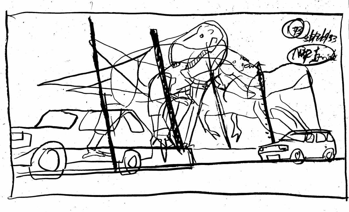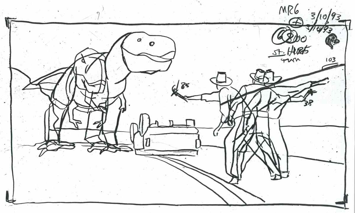 Phil Tippett: We had already spent a long time on storyboards and once they were locked, production wanted animatics of the T-rex paddock and the raptor kitchen scene to be laid out. At the same time, we had made a dinosaur bible where we picked the T-rex and raptor and did a walk cycle or a running cycle or behavioural things. Steven wanted them not to perform like monsters but have a palpable sense of being animals. So we had to cross-over between what was going to be computer graphics and practical dinosaurs by Stan Winston. I actually knew probably more about dinosaur motion than anyone else – I knew a bunch of paleos and would hang with them.