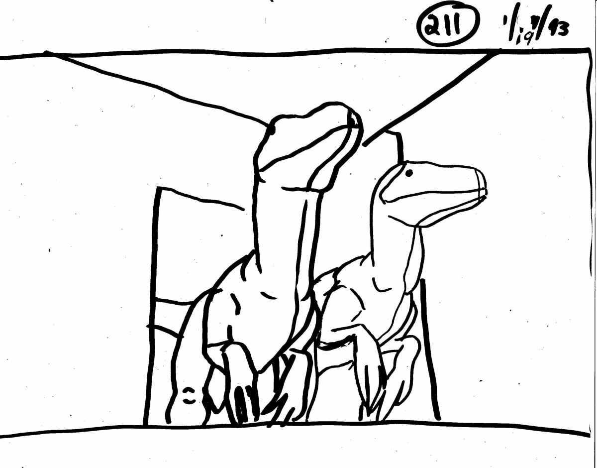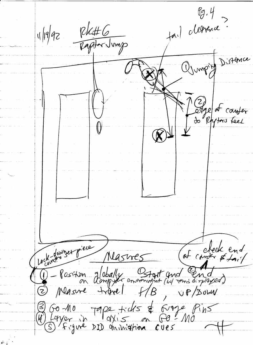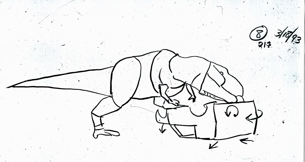 Randal M. Dutra: Since I had already choreographed and animated all of my shots (and more) of the Raptors and T.rex––in the pre-vis Animatics and “Movement Bible”––the essential groundwork was laid for my later DID animation. I was wholly familiar with the demands of each shot. Referring to the most current storyboards, I had Cameraman/Computer Tech Steve Reding shoot video of me with my hi-8 camera in a corner of the animation stage area. I pantomimed the dramatic actions and timings of the characters, further building and refining them. Then, with stopwatch in hand, I would break the video down into beats and frame counts. The whole architecture of the performance was worked out, complete with integrated behavioral references and accents.