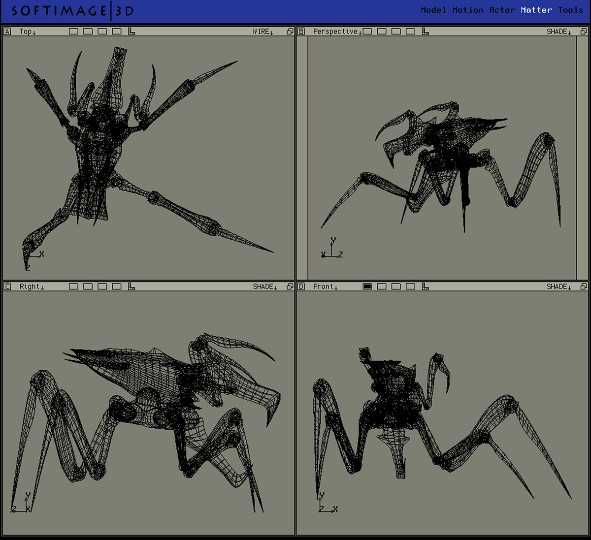 – At one point the troopers enter a valley after it’s been napalmed from the air. We needed to fill the valley with dead bugs in contorted poses. This was a huge pain with keyframing because if you crunched the keyframe model the IK chains would go haywire and rotate the legs in unexpected ways. So the pose would change, you’d get geometry intersections, and so on. But with a DID it was easy – twist the armature into a pose, snap one frame, repeat. As I recall it was Randy who got that shot and he was able to fill the valley with contorted bugs much faster than a keyframe animator could have.