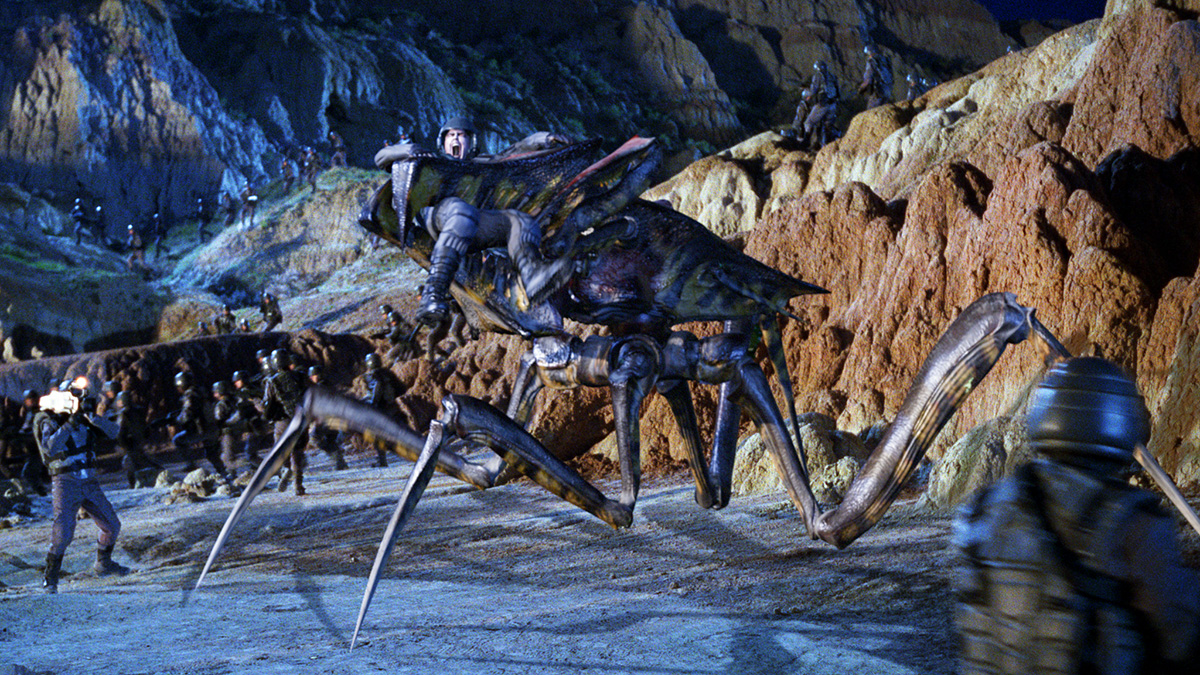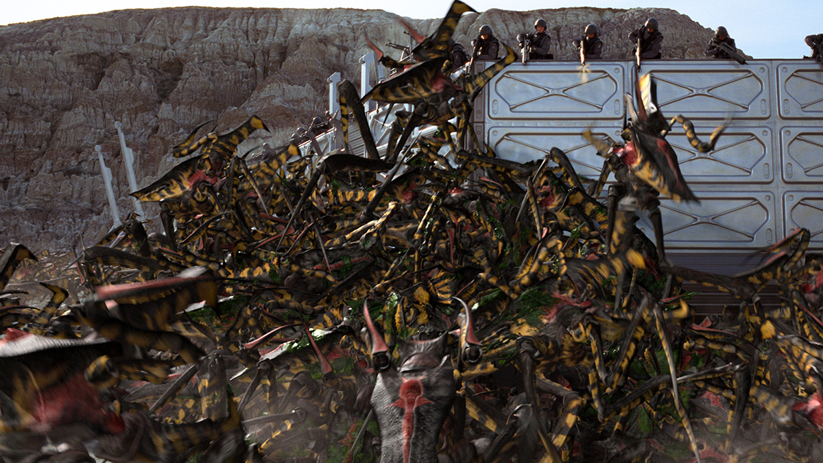 – When the Planet P compound is besieged, we had to do multiple wide shots of the entire landscape covered with bugs. We realised – rather late in the game – that once the bugs reached the compound they couldn’t keep walking. They had to stay in place, all packed together. So again, Kirrie cranked out a huge amount of bug animation, this time of bugs standing in place doing…whatever. There’s a shot where Lt. Rasczak turns around and sees bugs out to the horizon – that shot is basically Kirrie multiplied a million times, and she generated all that animation in a day or two.