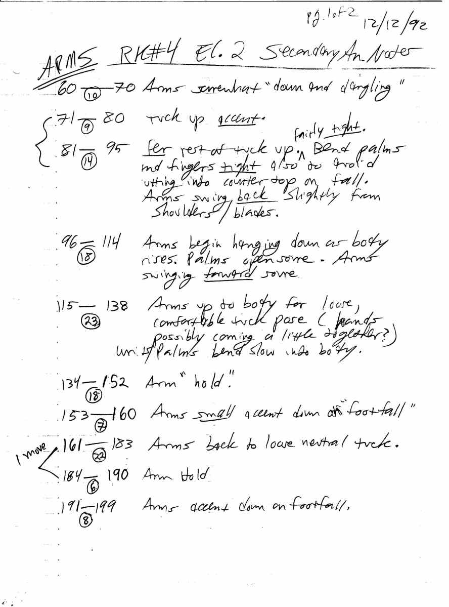 Randal M. Dutra: I made “secondary animation notes” (arms, fingers, toes, blinks, etc.) to accompany my already established action and choreography. These details by necessity cued off of the foundational performance. Computer Tech Adam Valdez artfully incorporated such notes, and also efficiently addressed various “emergencies” as they arose such as roving “floating feet”, a strange artifact that the DID system would occasionally gift us with. So the feet sometimes had to be re-locked-down/constrained in CG, even though the original DID animation had the feet firmly planted.