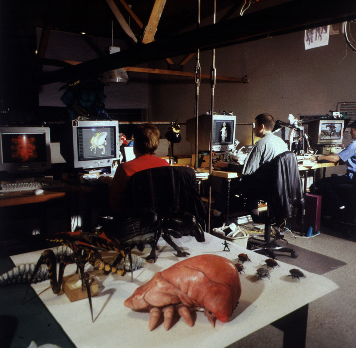 Again, the irony was that I was the supposed head of a stop-motion and CG animation department, but all my experience was in puppetry. I spent my free time messing with the empty DID stations and I realised that the bug model was choppy on screen in realtime, but the actual data was all being captured just fine. So we widened our search to include puppeteers, and pretty soon after that Kirrie Edis came on board. And that was the DID team – Tom and Randy mostly used their armatures frame by frame, and Kirrie worked mostly in realtime. Then they’d polish their captured data with the curve editor – they each developed their own workflow for that. But that fourth station we never were able to fill.