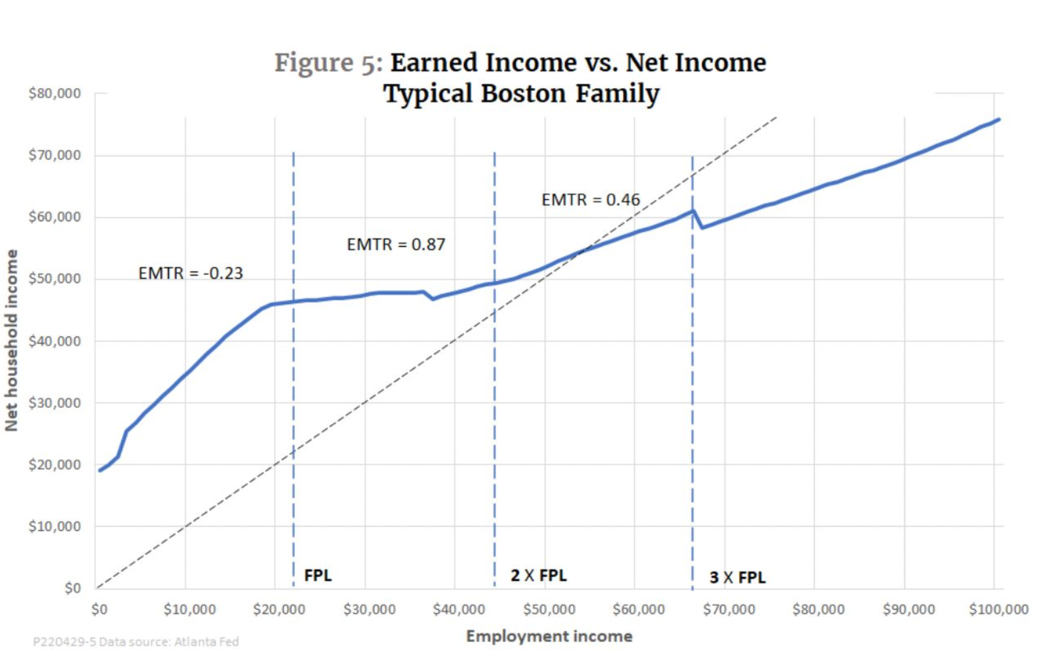 To be geeky for a second, in particular there’s a region (20 to 50K or so) where a family is treading water because their take-home pay almost flat-lines, just as they reach what should be escape velocity from the social safety net, on their way to reaching the American Dream. (The graph is from a different paper: Work Disincentives)