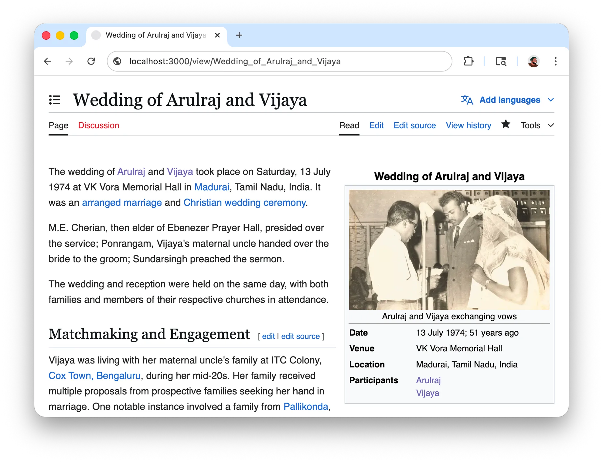 After the "interview", I had multiple pages of notes connecting the photos to events that happened 50 years ago. Since the account was historical, as an inside joke I wanted to see if I could clean it up and present it as a page on Wikipedia so I could print it and give it to her. So I cloned MediaWiki, spun up a local instance, and began my editorial work. I used the 2011 Royal Wedding as reference and drafted a page starting with the classic infobox and the lead paragraph.