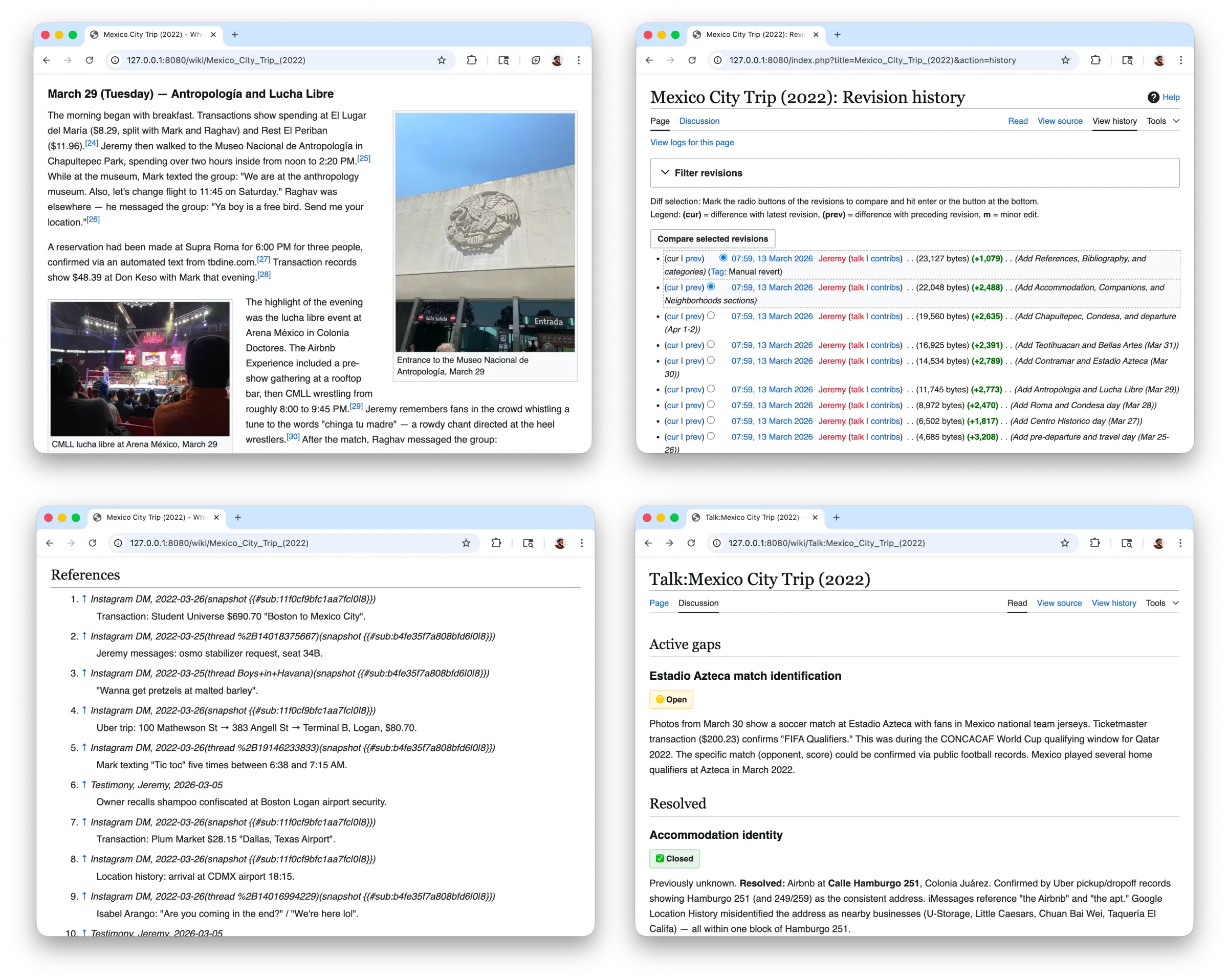 The MediaWiki architecture worked well with the edits, since for every new data source it would make amendments like a real Wikipedia contributor would. I leaned heavily on features that already existed. Talk pages to clarify gaps and consolidate research notes, categories to group pages by theme, revision history to track how a page evolved as new data came in. I didn't have to build any of this, it was all just there.