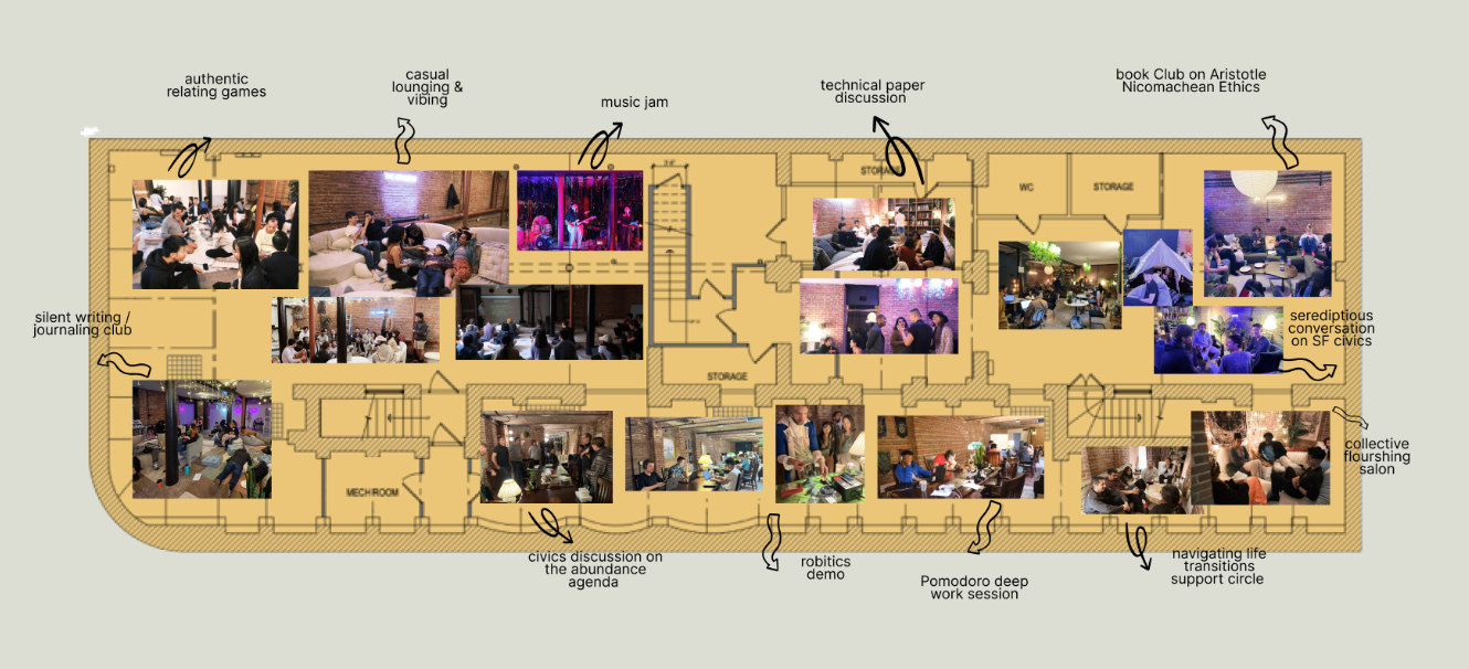 This is a major unlock for community building, because it creates a shared container for co-creation, a common ground between members, and a default place to go to bump into other members of the community. It lowers the friction to hosting events and hanging out with nearby friends. It provides a place for visitors to stay, which lowers the friction for new people moving nearby. And, it demonstrates a capacity for collective action that can be expanded upon.
