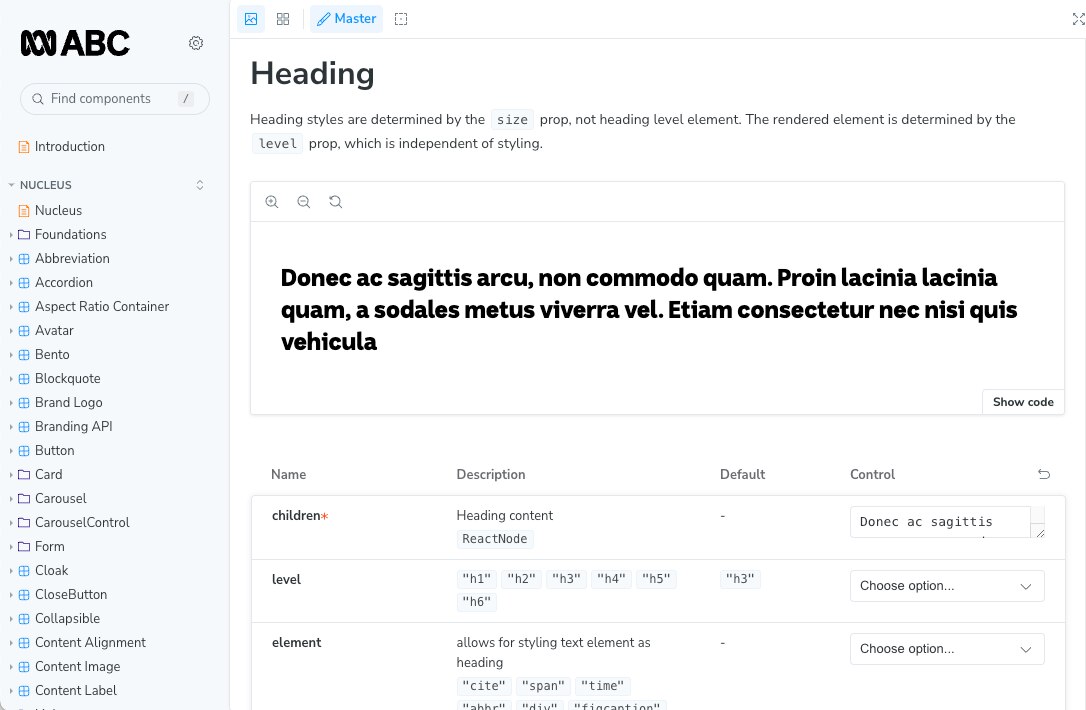 At ABC we use an open-source tool called Storybook. Storybook is used to organise and catalogue our components. Every component has a corresponding “Story” which documents how the component can be used and allows the reader to play with configuration options and see how it will render.