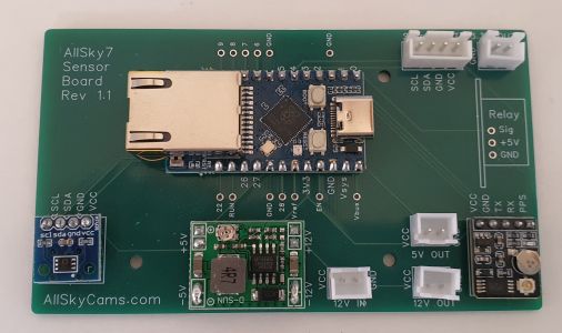 Starting from 2025, new system are equipped with a AS7 Sensor Board (AllSky7+ HS SB). This boards provides precise timing (1PPS) and geo-location, but also temperature and humidity inside and outside the dome. The sensor board comes optionally with a relay that can control a fan, heating device or cooling device, or any other system added by the camera operator, based on the climate inside and outside the dome. The sensor board provides additional digital ports for custom extensions.