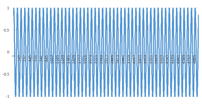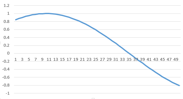 The data provided in the code's data folder contains a sinewave.csv file we created which contains 5001 time periods of a sine wave with amplitude and frequency of 1 (giving an angular frequency of 6.28) and a time delta of 0.01. The result of this, when plotted looks like this: