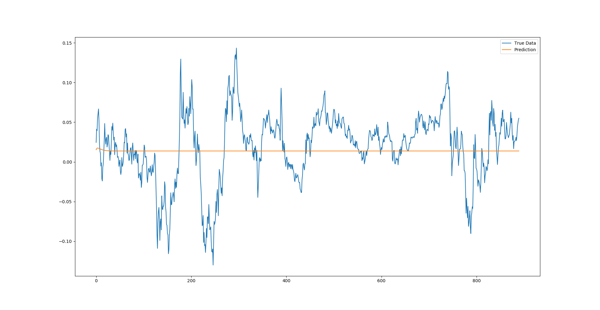 Running the data on a single point-by-point prediction as mentioned above gives something that matches the returns pretty closely. But this is slightly deceptive. Upon a closer examination, the prediction line is made up of singular prediction points that have had the whole prior true history window behind them. Because of that, the network doesn't need to know much about the time series itself other than that each next point most likely won't be too far from the last point. So even if it gets the prediction for the point wrong, the next prediction will then factor in the true history and disregard the incorrect prediction, yet again allowing for an error to be made.