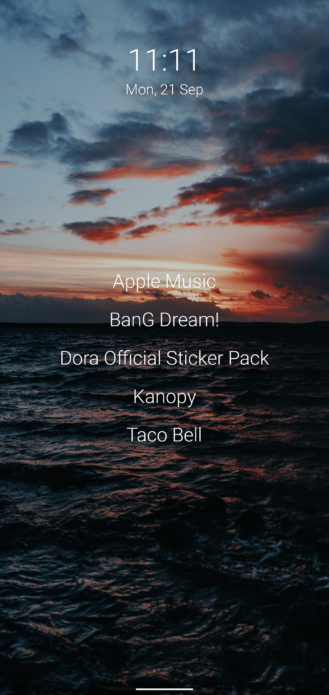 And minimal it is — there's time and date info up top, a list of apps below ... and that's it. The clock and app list can be set to left, center, or right orientations. A maximum of six app names can be displayed, but if you're the most minimal of minimalists, you can set it to show no apps at all. But wouldn't that render it useless? Not quite! By default, swiping to the left launches the camera and swiping to the right opens up the dialer, but you can customize these as you choose. A swipe up opens the full app list organized alphabetically.