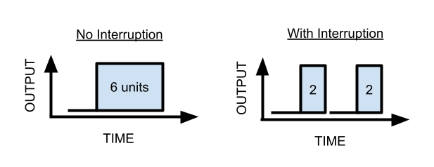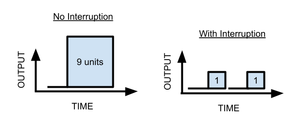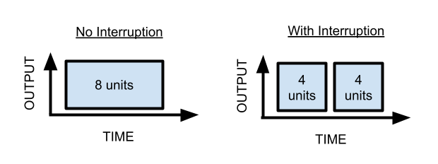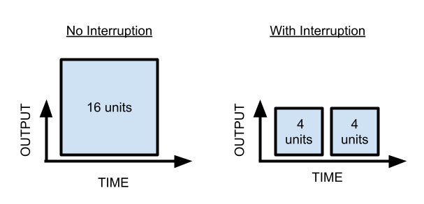 In this case, each interruption costs you two units of output (for the one hour of startup-time you now need to get back into things)—if you got interrupted once per hour, even very briefly, you would literally never get anything done.